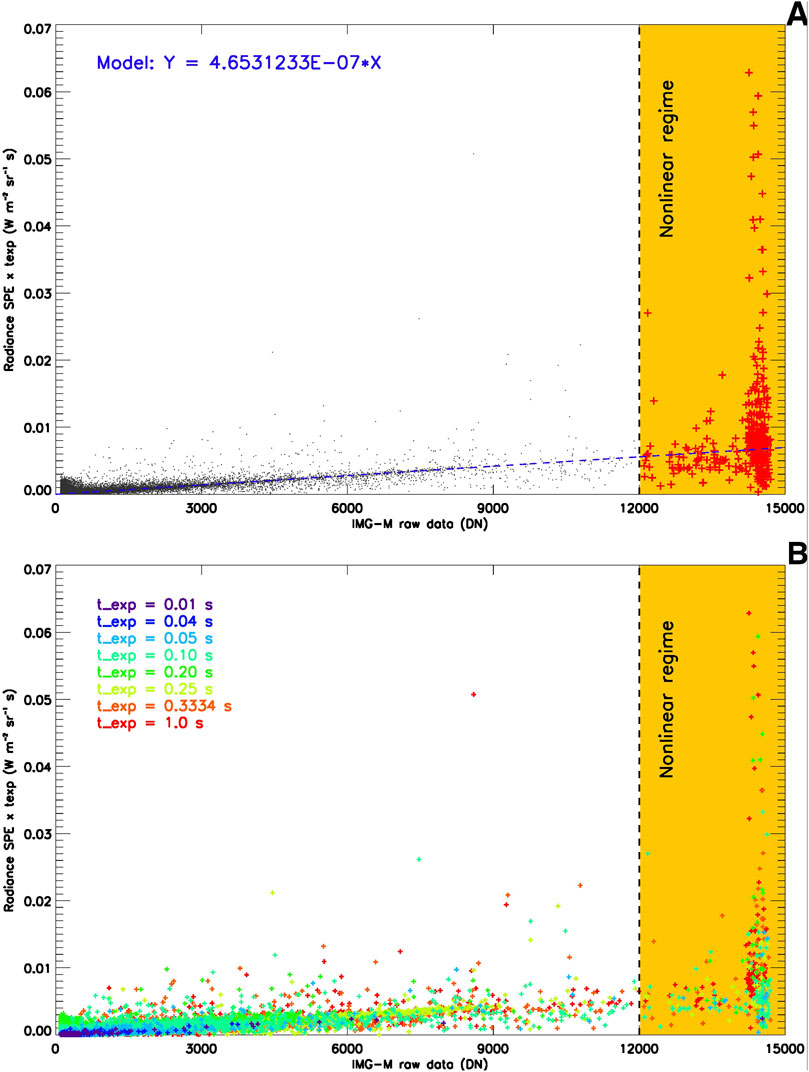 To cross-check JIRAM M-band imager and spectrometer, we used Io data acquired simultaneously by the M-band imager and the spectrometer. For each co-observed pixel, we calculated the spectrometer’s integrated radiance by summing its signal from 4.54 to 5.01 µm and multiplying by the average spectral sampling step (0.009 µm). We then adjusted this value by multiplying it by the imager integration time, yielding the radiance the M-band imager should have measured in a linear regime.