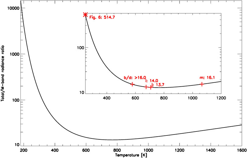 Figure 2. Ratio of total blackbody radiance to JIRAM M-band radiance as a function of temperature. The lower limit (180 K) reflects JIRAM’s in-flight noise threshold. The inset highlights the 250–1200 K range, where most JIRAM data cluster. Red crosses mark radiance maxima from panels tagged as m, i, j, and b/d in Figure 3 of Mura et al. (2020); for b/d, the 5.01 µm sensitivity limit is conservatively used. The red asterisk indicates a 250 K temperature from Figure 6 of Mura et al. (2020), typical of low-resolution (>100 km/px) JIRAM spectrometer data.