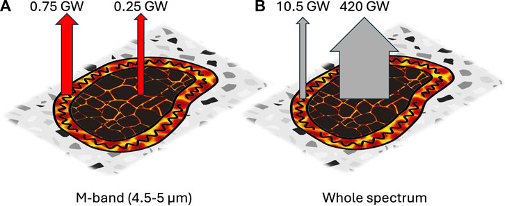 Figure 4. Power output from both the crust and the ring of Chors patera. The (A) panel shows contributions within the M-band, while the (B) panel shows the total power across all wavelengths.