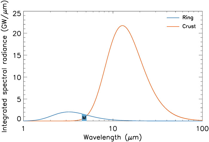 Figure 5. Same concept as Figure 4 for Chors Patera in terms of spectral radiance integrated over the solid angle and the emitting surface area (that is, spectral power). The orange curve represents the blackbody emission of the entire lake assuming a crustal brightness temperature of 227 K, while the blue curve is the thermal emission of the hot ring alone assuming a temperature of 900 K, an emissivity of 0.6, and a M-band-integrated power of 0.75 GW. The M-band (highlighted as a light blue trapezoid with the ‘M’ letter) captures only a minor portion of the total emission of the crust.