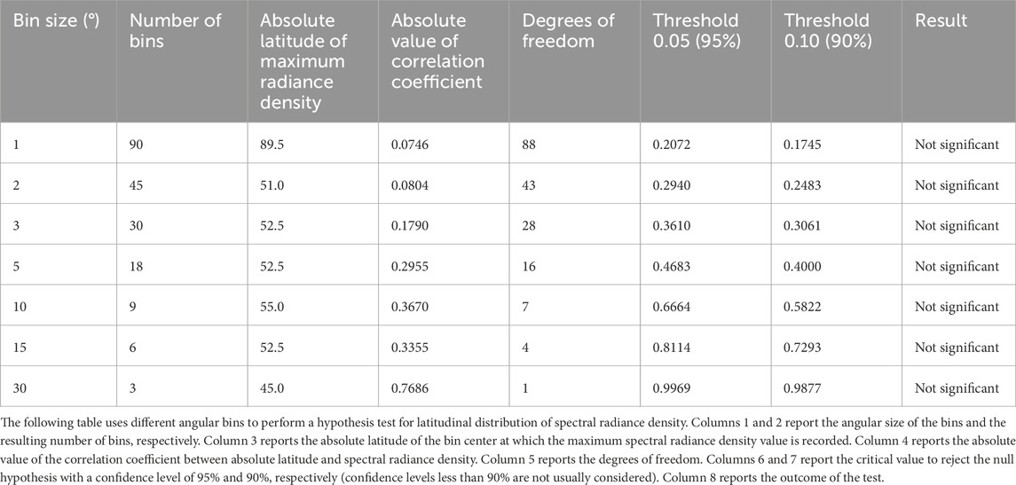 Briefly, no statistically robust correlation exists between spectral radiance density and absolute latitude, regardless of how the data are binned or analyzed. At large bin sizes (e.g., 30°), the effective sample size is extremely small (n = 3, df = 1), making any apparent correlation (e.g., r ≈ 0.77) statistically meaningless. With so few degrees of freedom, neither the presence nor the absence of a trend can be considered significant, since even exact tests place the critical |r| far above observed values. This limitation further justifies focusing on unbinned data and finer bins, all of which consistently show no robust trend with latitude.