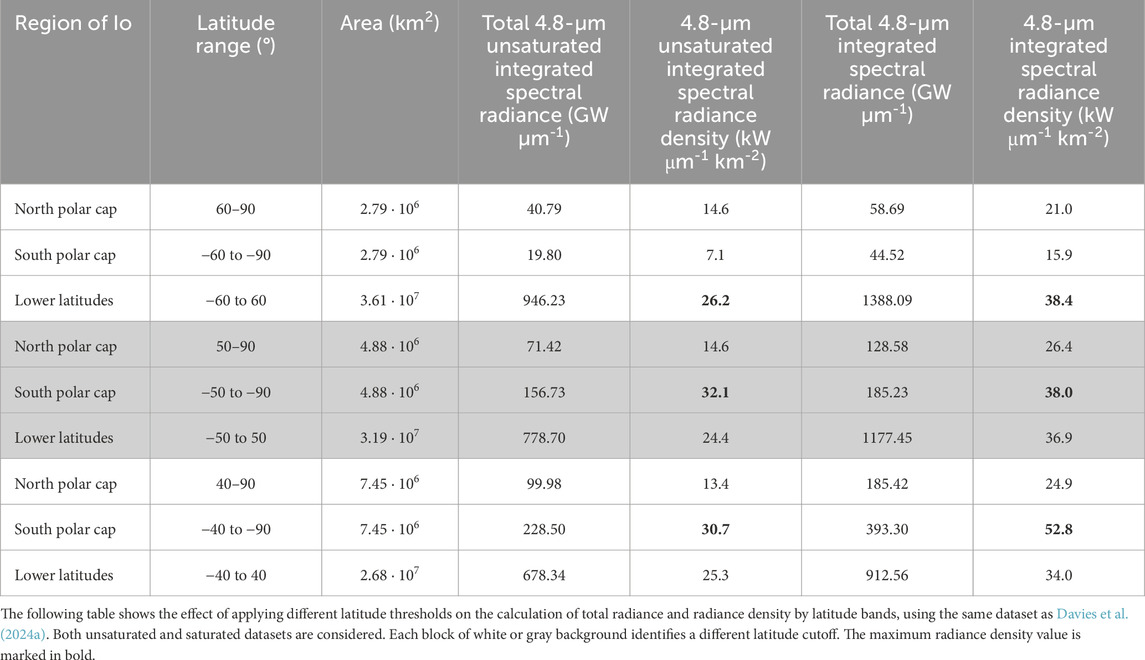 Davies, A. G., and Veeder, G. J. (2023). Near infrared spectral radiance at multiple wavelengths from io’s volcanoes 1: the low spatial resolution night-time galileo NIMS data set. J. Geophys. Res. Planets 128 (8), e2023JE007839. doi:10.1029/2023JE007839