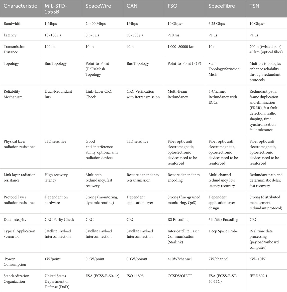 Current spatial interconnection bus technologies are advancing rapidly both domestically and internationally, aiming to enhance communication efficiency and reliability within spacecraft and between spacecraft systems. As a core enabler for space information networks and spacecraft interconnectivity, spatial buses play a pivotal role in modern aerospace architectures. Globally, multiple bus standards have been widely adopted in spacecraft, including MIL-STD-1553B, SpaceWire, CAN (Controller Area Network), FSO (Free-Space Optical), and SpaceFibre, with their key parameters compared in Table 1 below.