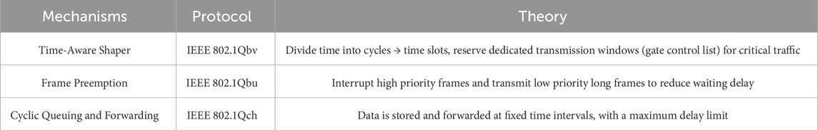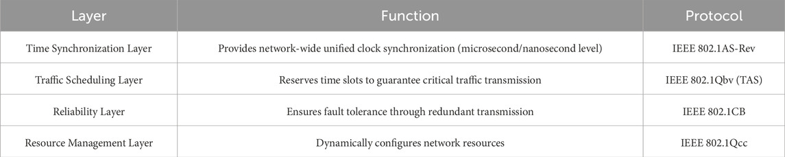 TSN achieves deterministic communication through a layered model. The hierarchical architecture is detailed in Table 2, and deterministic mechanisms are summarized in Table 3.
