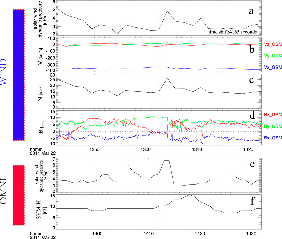 On 22 March 2011, a clear positive solar wind dynamic pressure pulse (from 2.6 nPa to 4.8 nPa) was detected by the WIND satellite (located at (213.10, 93.55, 21.57) Re in GSM coordinates) at 13:02:35 UT, as shown in Figure 1a. The solar wind speed increased from 331.9 to 362.3 km/s, while the solar wind density increased from 13.7 to 26.1 cm-3, as shown in Figure 1c. The solar wind dynamic pressure changes solely induced by the speed increase is approximately 0.48 nPa, whereas that solely attributed to the density increase is about 2.28 nPa. The solar wind velocity and density perturbations shown in Figures 1b,c indicate that the pressure pulse was primarily induced by an increase in solar wind density. The time delay for this pressure pulse to propagate from the location of the WIND satellite to the magnetosphere was approximately 4,165 s. This time shift was calculated using the satellite’s position and the solar wind velocity observed by WIND, and it was also compared with the time shift derived from the OMNI data. The 1-min time-resolution solar wind data from the OMNI database also showed a clear positive dynamic pressure pulse at 14:12:00 UT, as illustrated in Figure 1e. Following the arrival of the pulse at the magnetosphere, the SYM-H index recorded a distinct increase, indicating that the magnetosphere experienced a compression event. During this compression, the x- and y-components of the interplanetary magnetic field (IMF) remained consistently negative and positive, respectively. The z-component of the IMF briefly turned negative before switching back to positive, as shown in Figure 1d. In this event, the AE index remained below 110 nT (not shown in the figure), suggesting that no substorm occurred during the compression of the magnetosphere by the positive dynamic pressure pulse.