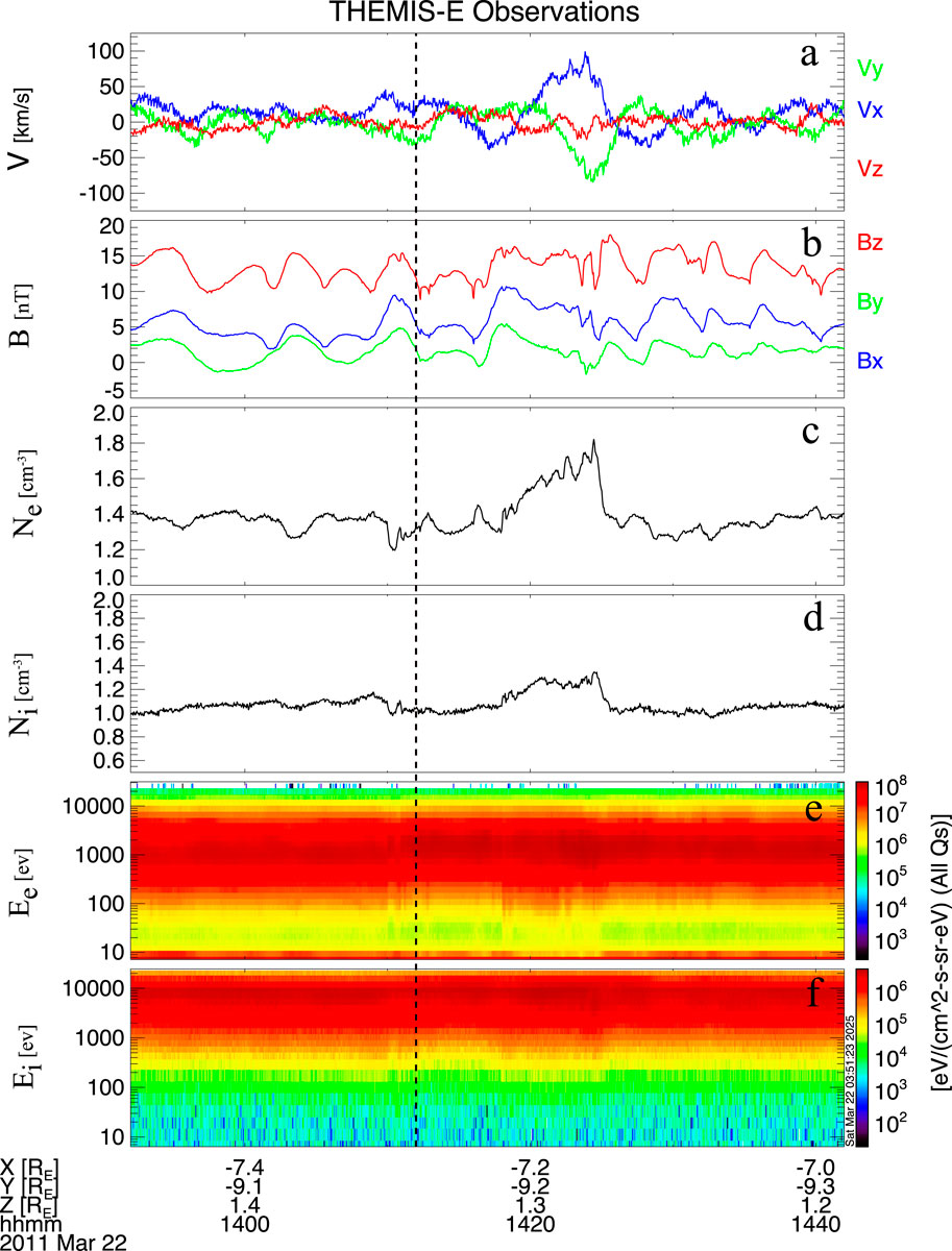 Figure 2. Observations of magnetospheric perturbations from the THEMIS-E satellite. (a) Three components of magnetospheric plasma flow velocity in GSM coordinates. (b) X, Y, and Z components of the magnetic field in GSM coordinates. (c,d) Electron and ion density profiles. (e,f) Electron and ion energy flux.