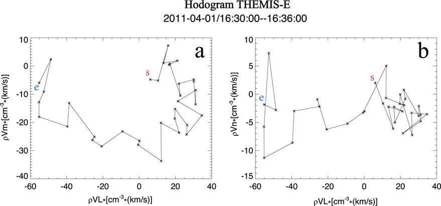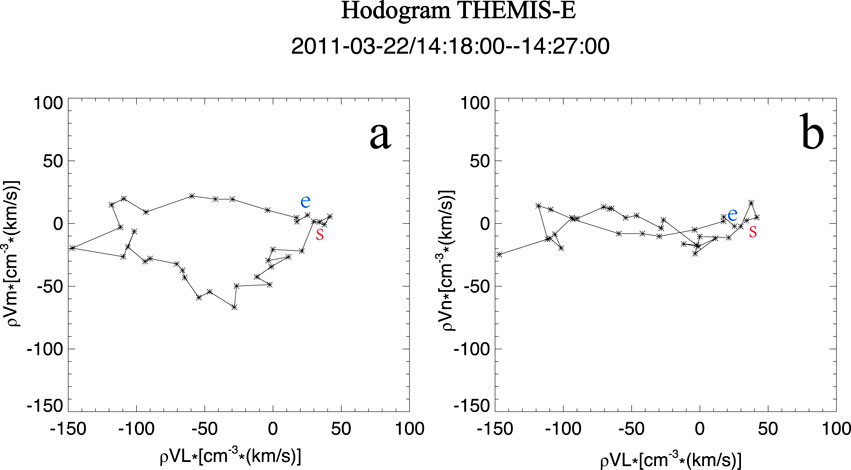 Figure 3. The hodogram derived from the MVA method illustrates the characteristics of the plasma flow vortex in the minimum variance coordinate system. ρVl, ρVm, and ρVn represent the maximum, intermediate, and minimum variance directions in the MVA coordinate system, respectively. Panel (a) shows the hodogram in the maximum–intermediate variance plane, while panel (b) presents the maximum–minimum variance components, demonstrating the rotational flow structure.