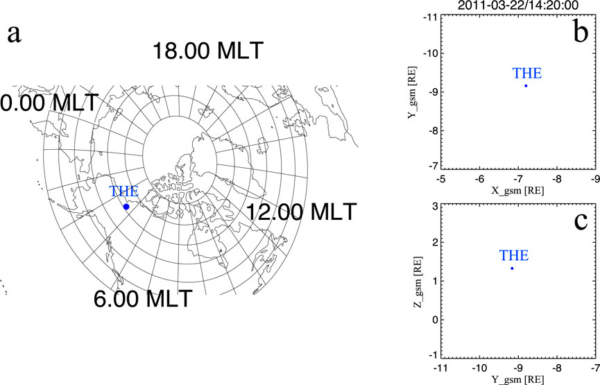 Figure 4. The footpoint of the THEMIS-E satellite in the altitude-adjusted corrected geomagnetic coordinates (AACGM) in the Northern Hemisphere. The blue solid dot represents the location of the THEMIS-E satellite footpoint. (a) Footpoint location of THEMIS-E mapped to the ground. (b,c) Positions of THEMIS-E in the GSM coordinate system shown in the xy and yz planes, respectively.