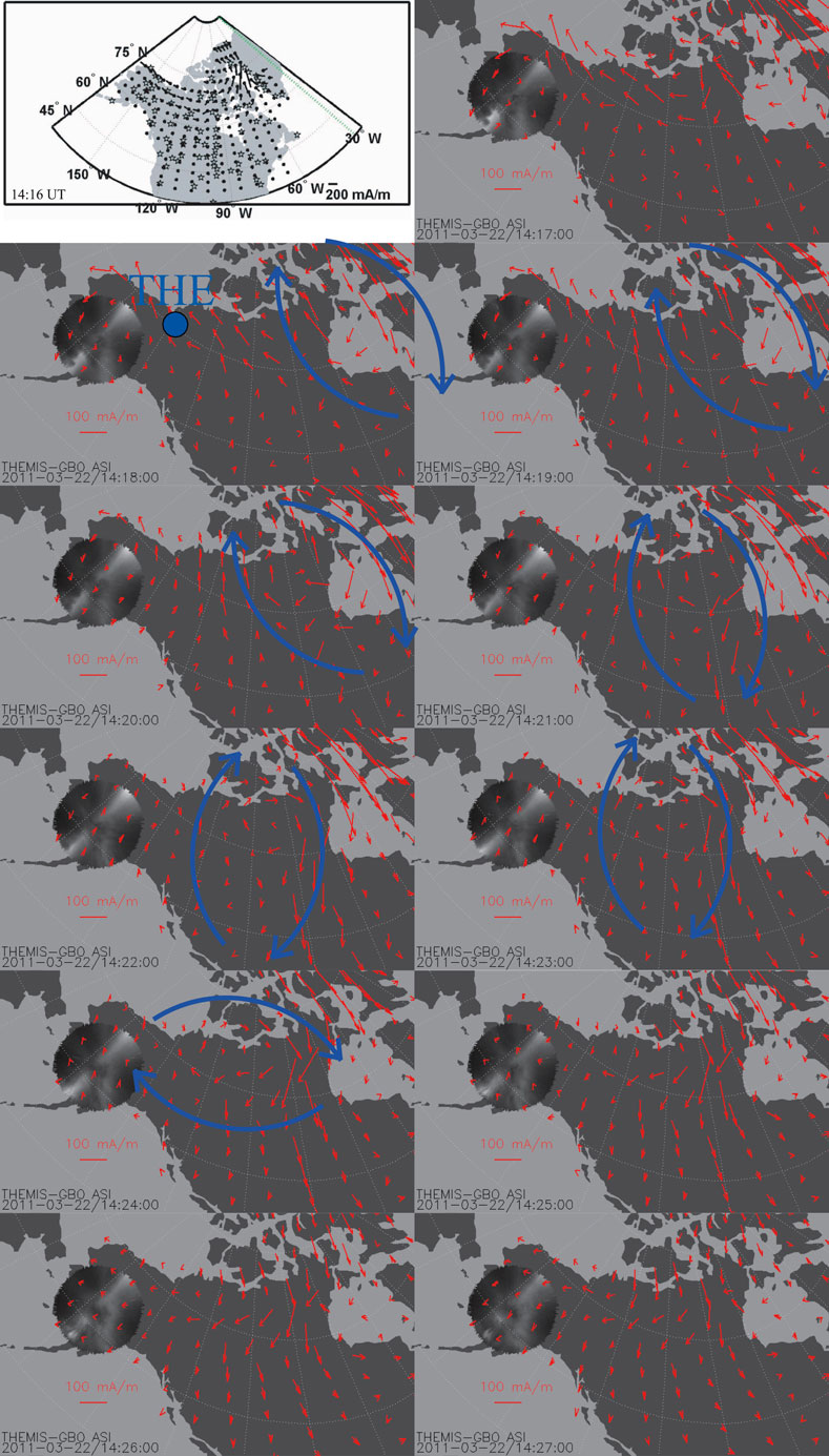 Figure 5. Time series of equivalent ionospheric currents (EICs) near the footpoint of the THEMIS satellite in the Northern Hemisphere. The stars in the 14:16 UT image correspond to the ground magnetometers used in this case. The blue solid dot indicates the footpoint of the THEMIS-E satellite. The magnitude of the EICs is represented by the length of the vectors, with the reference scale shown in the lower left corner. The blue vectors indicate the eic
