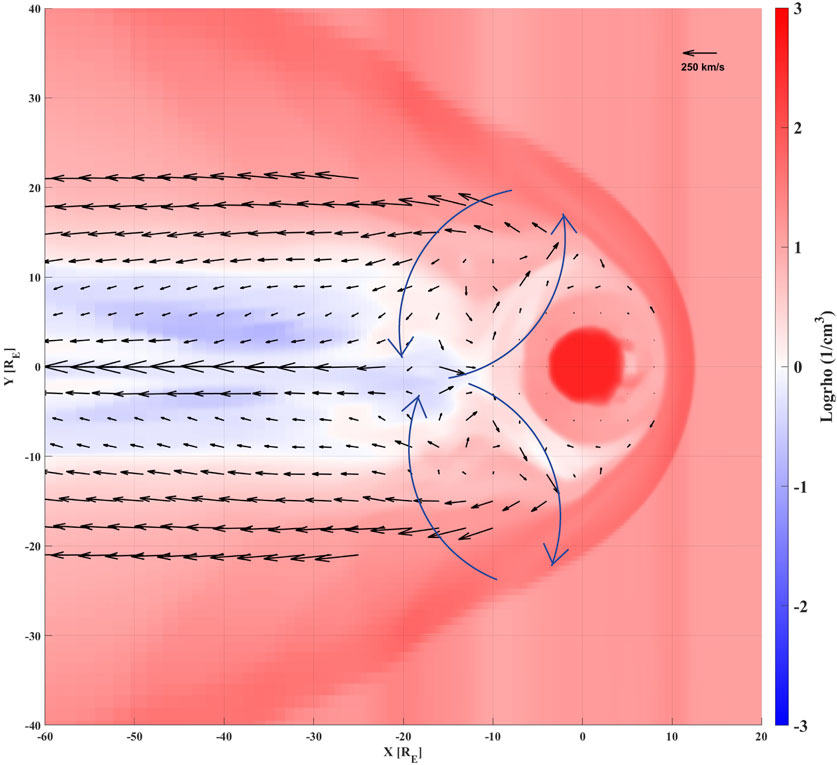 Figure 6. The global MHD simulation results. The arrows represent plasma velocities, and the background color represents plasma density. The blue vectors show the two clockwise and counterclockwise magnetospheric vortices in dawnside and duskside magnetosphere, respectively.