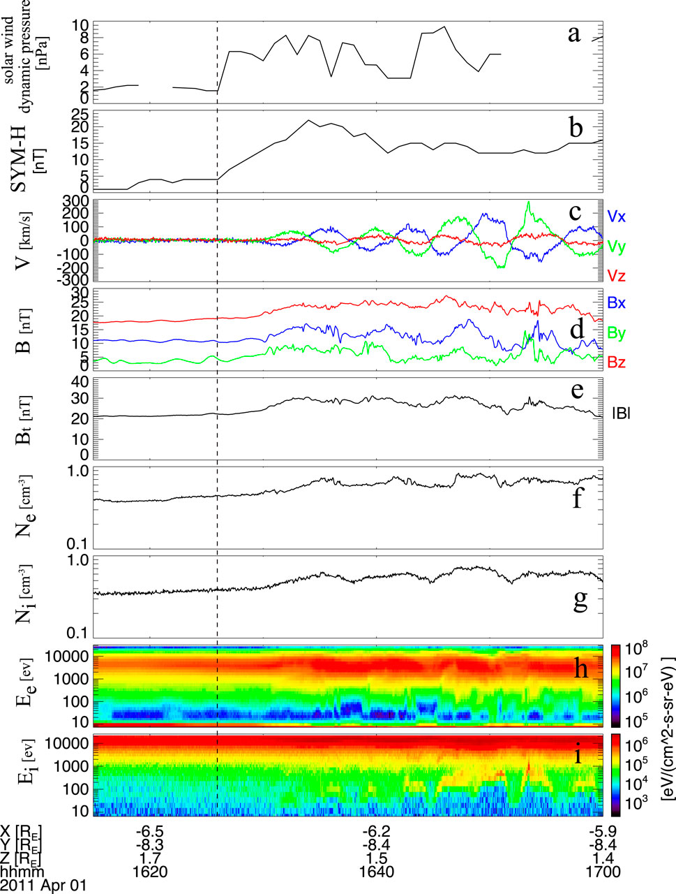 Figure 7. Solar wind and interplanetary magnetic field observations from the OMNI database, together with magnetospheric observations from the THEMIS-E satellite. (a) Solar wind dynamic pressure. (b) SYM-H index. (c) Three components of magnetospheric plasma flow velocity. (d) Three components of the magnetic field in GSM coordinates. (e) The total magnetic fields. (f,g) Electron and ion densities. (h,i) Electron and ion energy fluxes.