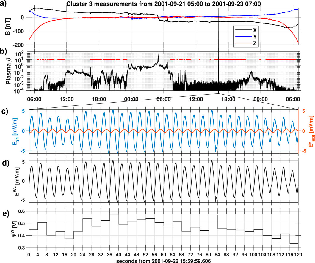 Figure 1. Example of plasma wake detection during a lobe crossing by Cluster 3. (a) In situ magnetic field in the Geocentric Solar Ecliptic coordinates measured using the FGM instrument. (b) Plasma beta calculated from the CIS data (black curve) and periods in which the plasma wake was detected (red dots). (c) Electric fields measured using the EFW (spacecraft-scale) and the EDI (background). (d) Electric field derived from the differences in the measurements between the two electric field instruments