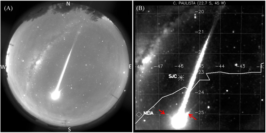 Figure 1. (A) Raw all-sky image on 25 May 2023, at 08:00:46 UT in the near infrared (NIR) band from 715 to 930 nm, showing a very bright meteor terminating in a very bright fireball with terminal flare located at Right Ascension 21 h 28 min 18 s and Declination −65° 15′ 34″. (B) Shows the same bright meteor crossing the zenith of Cachoeira Paulista (22.7°S, 45°W) observatory terminating in a very bright fireball with terminal flare located on the Atlantic Ocean. Unwarped image (B) represents an area of the processed image of 122,500 km2 (350 km × 350 km), assuming the airglow layer height around 97 km. Above the white continuous line we have the continent and below the Atlantic Ocean. Still in image (B), the asterisk symbol indicates the location of São José dos Campos (SJC) observatory where we have a sodium/potassium lidar and the diamond (NEIA), the location of one of the GNSS network receivers closest to the bolide explosion. The red arrows indicate that during the explosion of the super bolide, fragmentations (luminosity spikes in the fireball) occurred and possibly threw part of the original mass in specific directions.