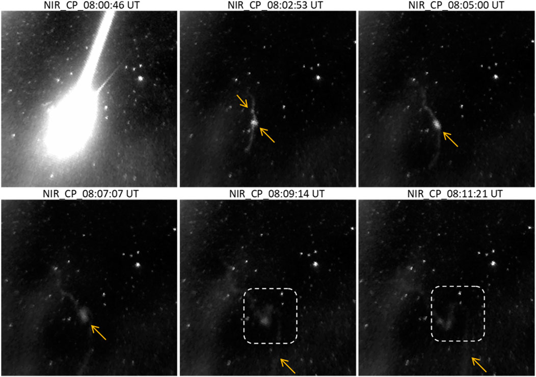To highlight the meteor train after the fireball, a zoom in the images can be seen in Figure 2 (the images were cropped around the fireball). The first NIR image, obtained at 08:02:53 UT after the initial fireball, shows a bright train, already showing the effects of wind distortion. The following four images show the airglow decreasing intensity with further wind distortion as shown by yellow arrows. The last image (not shown in Figure 2) on which the train is still visible in our data was 14 min after the fireball. The long-lived train observed in NIR airglow suggests that it could be related to emissions from the OH bands, which emission peak occur around 87 km. However, we propose an alternative explanation for the train observed through the wide-band NIR filter: the main emission may be a continuum. This topic, however, is beyond the scope of this work.