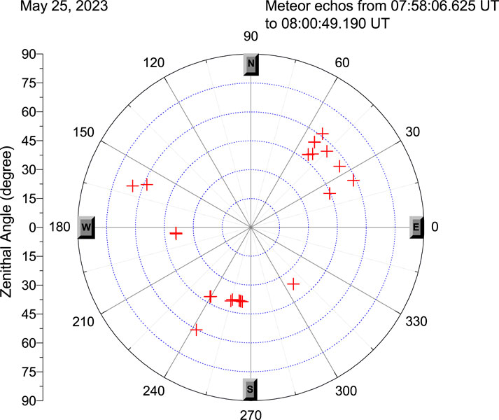 Figure 3. The azimuthal and zenithal distribution of meteors echoes recorded on 25 May 2023, during the period from 07:58:06.625 UT to 08:00:49.190 UT.