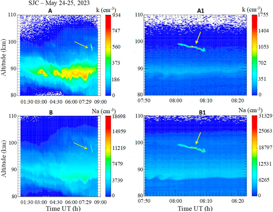 Figure 5. The height-time evolution of potassium (A) and sodium (B) layers observed from 01:00 UT to 08:35 UT on May 24–25, 2023, using a dual-beam sodium/potassium lidar system. After 08:01:16 UT is possible to observe increases in the sodium and potassium layers in an altitude range between 96 km and 99 km due to the meteor ablation/explosion, as indicated by the yellow arrows. The (A1,B1) show a zoom in the period which there was a short-lived (∼9 min) sudden increase in the sodium and potassium layers, in an altitude range between 96 km and 99 km due to the meteor ablation/explosion (also indicated by the yellow arrows).