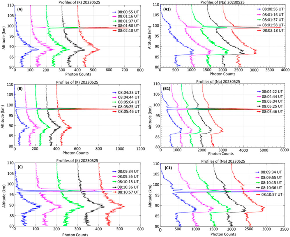 Figure 6. Photon counts time series (density profiles) of potassium [panels (A),(B),(C)] and sodium [panels (A1),(B1),(C1)] values prior to, during, and after the meteor explosion event on 25 May 2023. The lidar has a range resolution of 96 m and took 20 s time integrations. The spike in both sodium/potassium layers (sporadic layers), in altitude range of 96–99 km is due to advection of single bolide train across of the lidar field of view (FOV).
