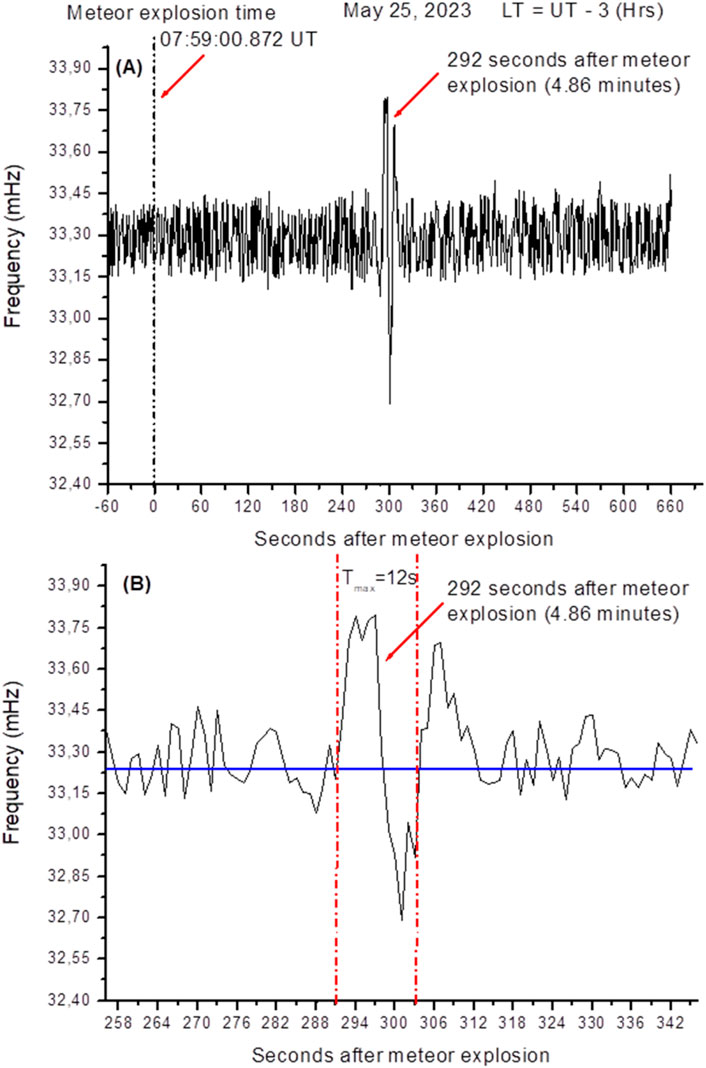 Figure 8. (A) An impulsive frequency signal was detected at approximately 33.3 mHz, occurring with a delay of 292 s (4.86 min) following the fireball event. (B) Period at maximum amplitude (zoomed in the range from 254 s to 356 s) after the super bolide explosion. The period observed at maximum amplitude was applied to the empirical Equation 1 to infer the energy injected by the super bolide in the upper atmosphere/ionosphere. In this figure, the two vertical red dot bars demarcate the period at the maximum amplitude of impulsive atmospheric infrasonic source, which in the present event was 12 s.