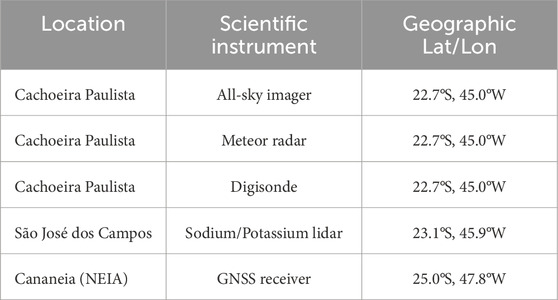 We think that the data presented on this super bolide event are quite unique for their completeness. They include all-sky images to determine the trajectory and location of the bolide explosion, sodium/potassium lidar measurement to estimate the altitude of the explosion, meteor radar to estimate the winds in the mesosphere-lower thermosphere (MLT) region, digisonde to observe if sporadic-E layer occurred during the event and GNSS network to infer the hydrodynamic energy injected in the upper atmosphere/ionosphere. In addition, neutral density variations measured by the Swarm B satellite were analyzed during this strong meteor explosion. Table 1 shows the locations of the ground-based scientific instruments used in this study.