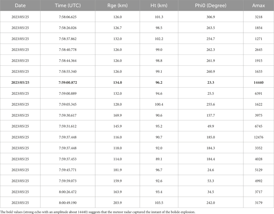 Figure 3 presents the azimuthal and zenithal distribution of meteors observed between 07:58:06.625 UT and 08:00:49.190 UT. The figure presents echoes with amplitude (Amax) greater than 1,200. As shown by the figure, the meteor radar echoes were predominantly observed along two specific directions. This directional pattern is probably linked to the timing of the meteor explosion, which occurred at 07:59:00.872 UT. The strong echo detected by the SKiYMET radar at this precise moment, at an altitude of 96.2 km, provides evidence that the radar probably captured the exact instant of the bolide explosion. The correspondence between recorded meteor echoes and the explosion’s timing demonstrate the SKiYMET meteor radar system’s capability to accurately identify not only week but major meteor events occurring in the upper atmosphere.