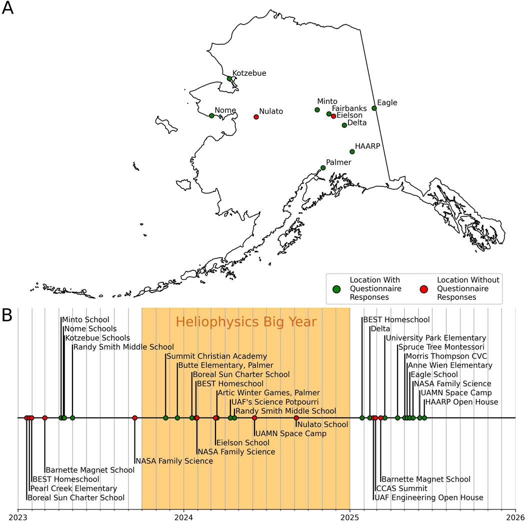 Figure 2. The locations where the planetarium has visited since 2023 are shown in panel (A), and indicate where the questionnaire responses are taken from. Fairbanks has locations both with and without responses. Panel (B) shows a timeline of planetarium shows, with the Heliophysics Big Year highlighted in orange. Planetarium shows with questionnaire responses (green circles) are shown above the central line, and shows without any questionnaire responses (red circles) are shown below the central line.