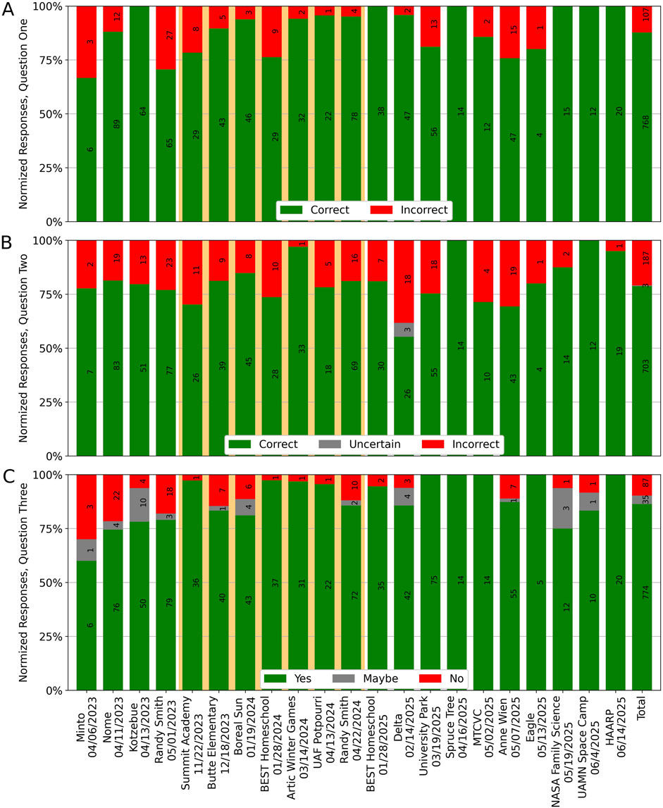 The responses to each question described in the previous section are summarized in Figure 4. Panel (A) shows that in all but two programs (Minto and the 2023 Randy Smith programs) more than 75% respondents correctly identified that Earth needs solar wind, magnetic field, and gases to create aurora. In more than 75% of the planetarium programs, over 75% of the respondents correctly answered that planets other than the Earth can have aurora (Figure 4B). Across all the planetarium programs, more than 85% of the respondents indicated that they were interested in learning more about the aurora, sun, or space (Figure 4C).