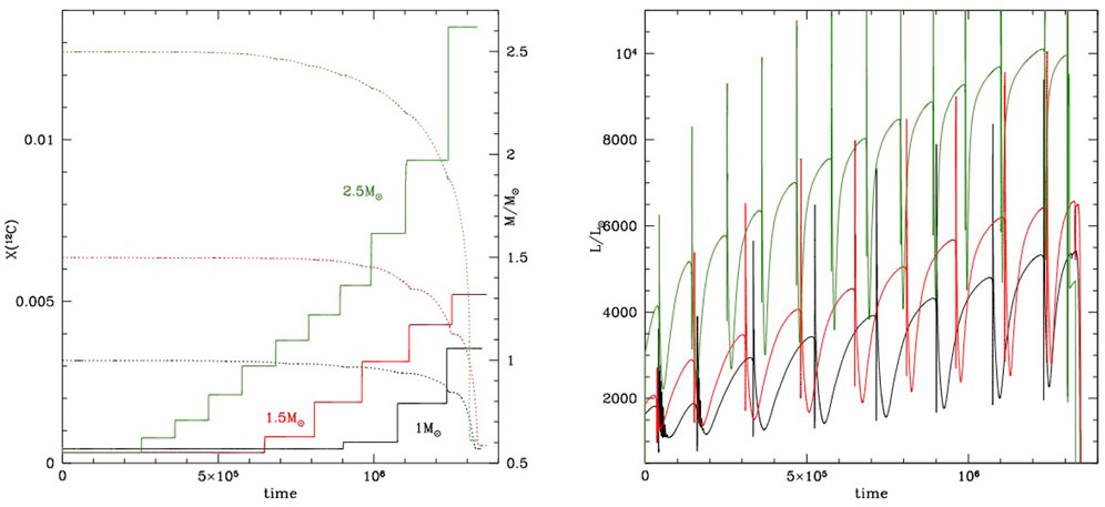 Figure 1. Time variation of the surface carbon mass fraction (left panel, solid lines, scale on the left), stellar mass (left panel, dotted lines, scale on the right) and luminosity (right panel), of model stars of mass