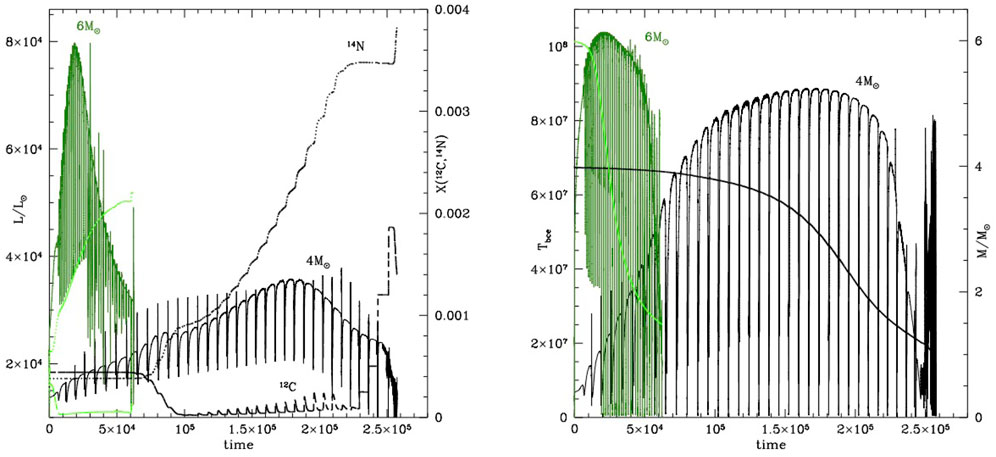 Figure 2. Time variation of the luminosity (left panel, solid lines, scale on the left), surface carbon and nitrogen abundances (left panel, scale on the right, dashed and dotted lines, respectively), temperature at the base of the envelope (right panel, scale on the left), stellar mass (right panel, scale on the right) of model stars of initial mass