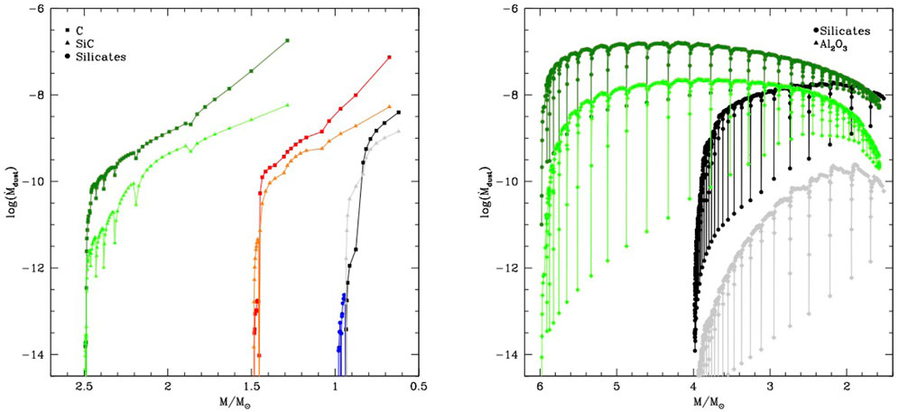 In Figure 3 we show the rates of production of the main dust species, for the stars belonging to the groups b) and c) introduced before. These results were obtained by applying the scheme proposed by Ferrarotti and Gail (2006) to the evolutionary sequences calculated by means of the ATON code, solving the set of equations descrived in Ventura et al. (2012). We do not show any result regarding group a) stars, as little dust is formed in their winds, because the mass loss rates experienced are below or of the order of