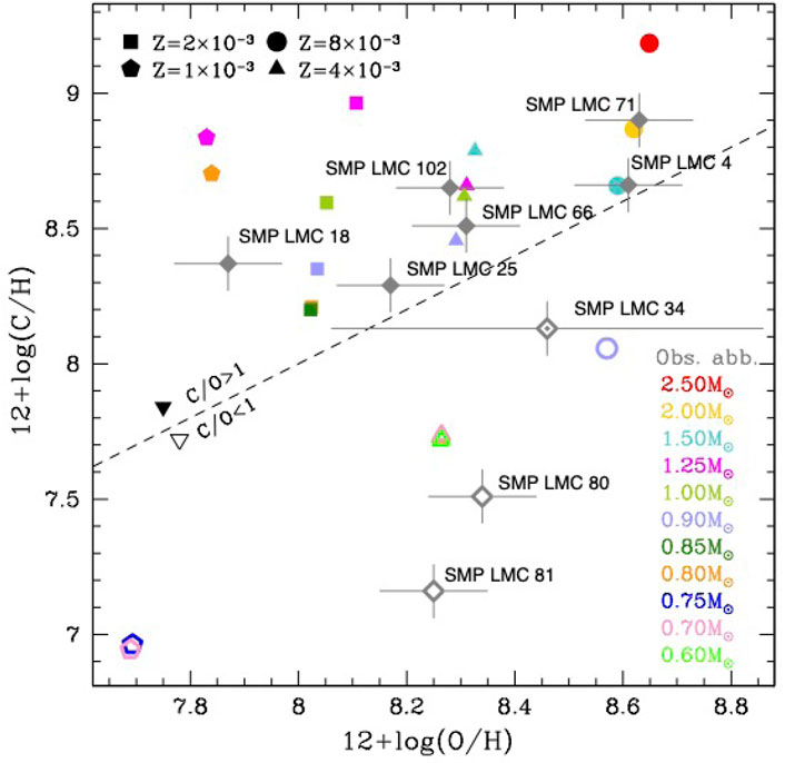 Figure 4. Carbon and oxygen abundances (gas phase) of the 9 PNe in the sample considered by Tosi et al. (2024), indicated with grey points, separated in C-rich (full points) and oxygen-rich (open points) sources. No clear chemical tagging was possible for SMP LMC 34, owing to the large uncertainties associated to the oxygen abundance. Coloured points indicate the final abundances of model stars of different mass and chemical composition, calculated by means of the ATON code for stellar evolution, used also for the evolutionary sequences shown in the Figures 1–3.