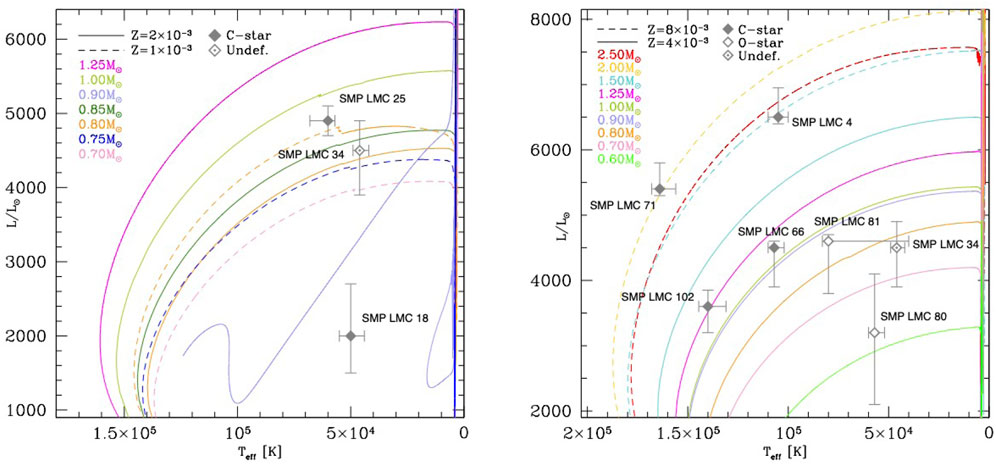 The characterization of the individual stars of the sample is further strenghtened by the comparison between their position on the HR diagram and the evolutionary tracks, calculated for various values of the initial mass and chemical composition. These evolutionary sequences are taken from Ventura et al. (2014) as far as the AGB part is concerned, and were extended to the post-AGB and PNe phases by Marini et al. (2021) and Kamath et al. (2023). This comparison is shown in Figure 5. For clarity sake we separated the tracks of metal poor model stars, reported in the left panel, from those of the sub-solar chemistry counterparts, shown in the right panel. From the combined analysis of the surface chemical composition of the PNe and their position on the HR diagram we conclude that the sample of LMC PNe considered is composed of two metal-poor stars descending from low-mass progenitors (SMP LMC 81 and SMP LMC 81), with an O-rich chemistry, and 7 C-rich objects, of various mass and metallicity, spanning the