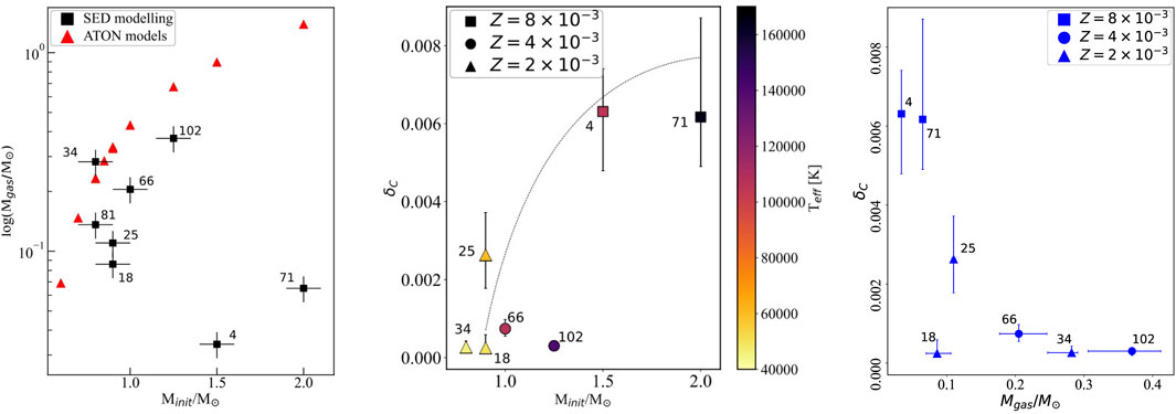 Figure 6. The mass of the gas in the nebula and of the dust-to-gas ratio of the C-rich stars in the sample presented in Figure 4 are shown as a function of the derived progenitor’s mass in the left and middle panels, respectively. The relationship between the dust-to-gas ratio and the mass of gas is shown in the right panel.