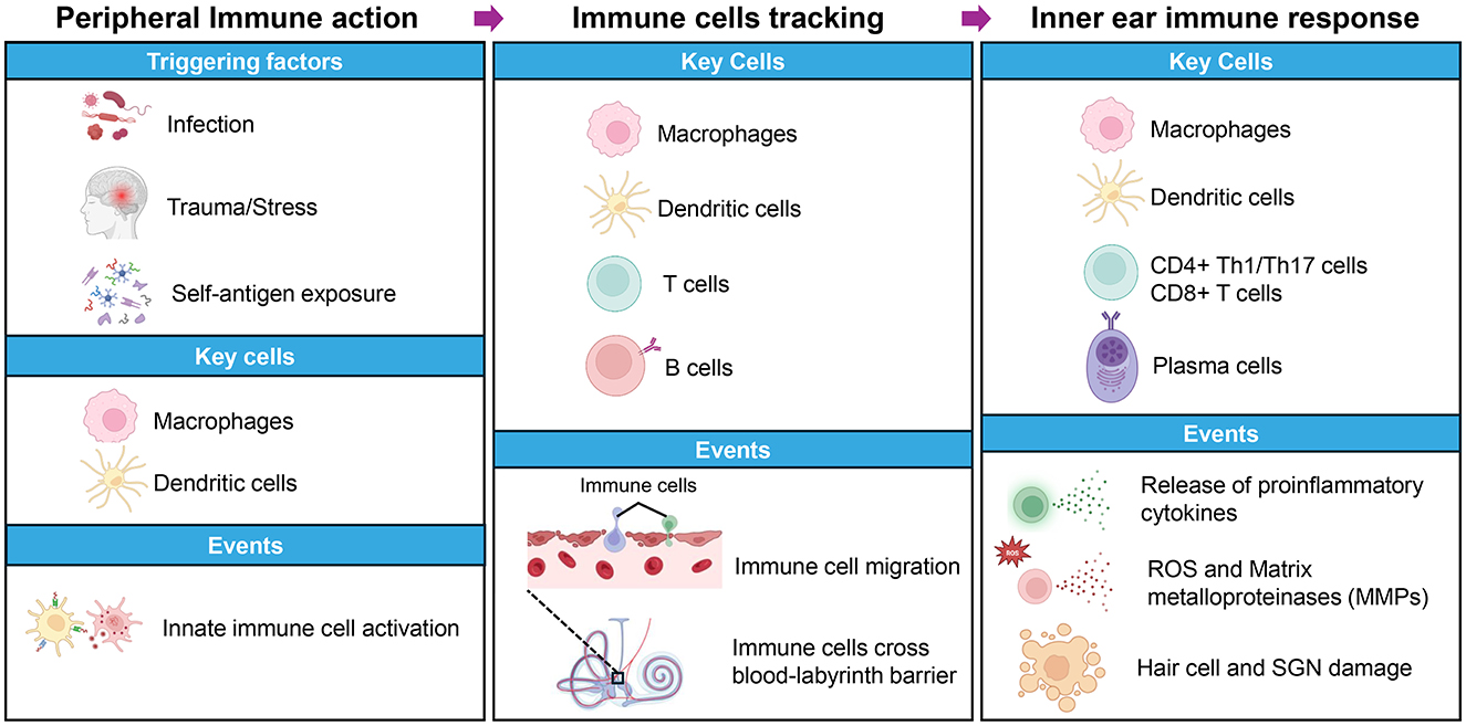 Figure 1. Overview of autoimmune inner ear disease (AIED) pathogenesis. This schematic depicts the major factors, immune cells, and molecular events driving the onset and progression of AIED. The left panel shows potential triggers such as infection, trauma or stress, and self-antigen exposure, along with early involvement of macrophages and dendritic cells that initiate innate immune responses. The middle panel highlights key immune players including macrophages, dendritic cells, T cells, and B cells and processes like immune cell migration and compromise of the blood labyrinth barrier. The right panel illustrates later disease stages, focusing on macrophages, dendritic cells, CD4+ Th1 and Th17 cells, CD8+ T cells, and plasma cells. These contribute to the release of proinflammatory cytokines, production of reactive oxygen species (ROS), and matrix metalloproteinases (MMPs), ultimately causing damage to hair cells and spiral ganglion neurons (SGN).