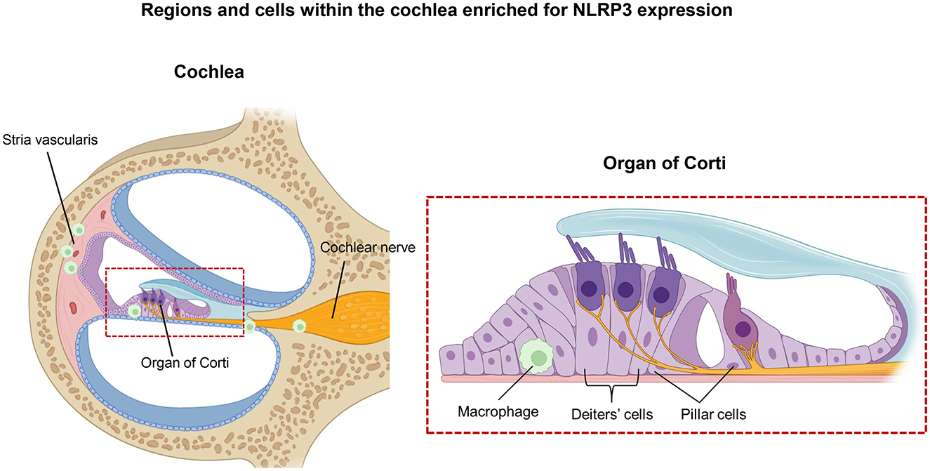 Figure 2. Regions and cells within the cochlea enriched for NLRP3 expression. Anatomical regions and specific cochlear cell types exhibiting elevated NLRP3 expression are shown, with emphasis on structural localization and cellular specificity. The left panel presents a cross-sectional view of the cochlea, highlighting key structures such as the stria vascularis and the cochlear nerve. A red box marks the location of the Organ of Corti, which is shown in greater detail in the right panel. In this magnified view, specific cell types, including macrophages, Deiters' cells, and pillar cells, are identified as sites of enriched NLRP3 expression.