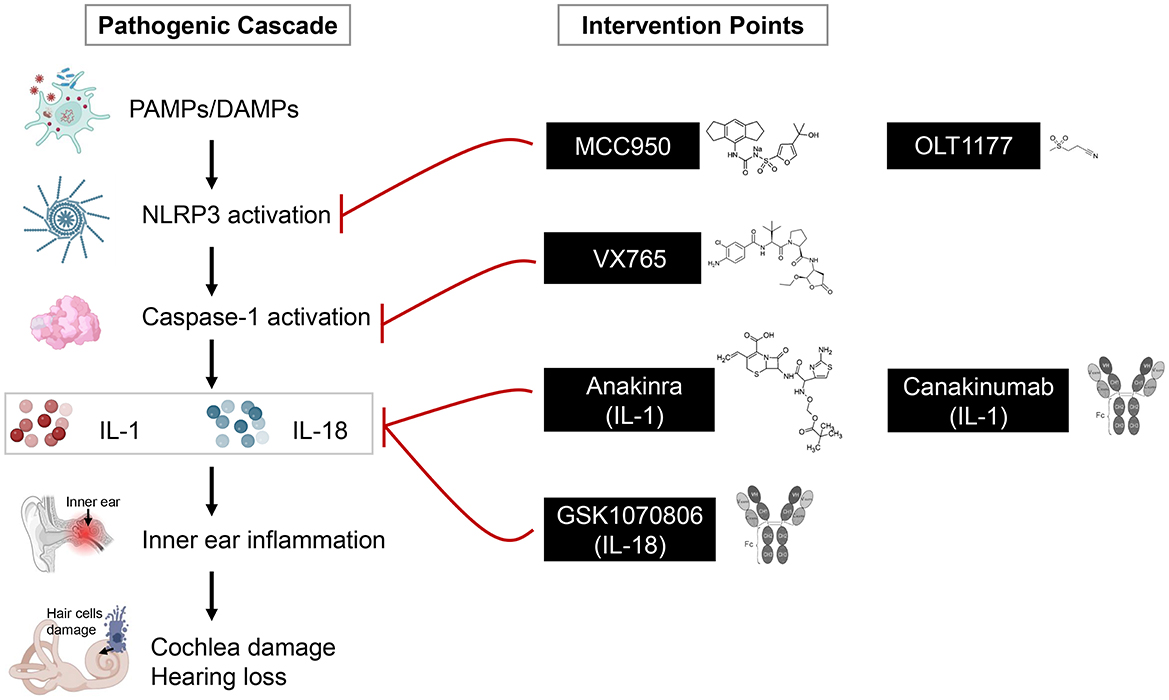 Figure 3. Pathogenic cascade and potential intervention points in inner ear inflammation. A simplified pathogenic cascade leading to inner ear damage is depicted, highlighting key stages of inflammation and corresponding therapeutic targets highlighted along the pathway. The left side illustrates the sequence of events beginning with initiating triggers including pathogen-associated molecular patterns (PAMPs) or damage-associated molecular patterns (DAMPs) such as viral infection, cellular stress, or inflammation. These triggers activate immune cells, which release inflammatory mediators that ultimately damage inner ear structures, particularly hair cells. The right side presents therapeutic compounds that intervene at specific stages of the cascade. NLRP3 inhibitors (MCC950, OLT1177), caspase-1 blockers (VX765), and cytokine-targeting agents such as IL-1 pathway inhibitors (anakinra, canakinumab) and an IL-18–neutralizing antibody (GSK1070806). MCC950, OLT1177, VX765, and anakinra are shown with their chemical structures, while canakinumab and GSK1070806 are represented with antibody structures.