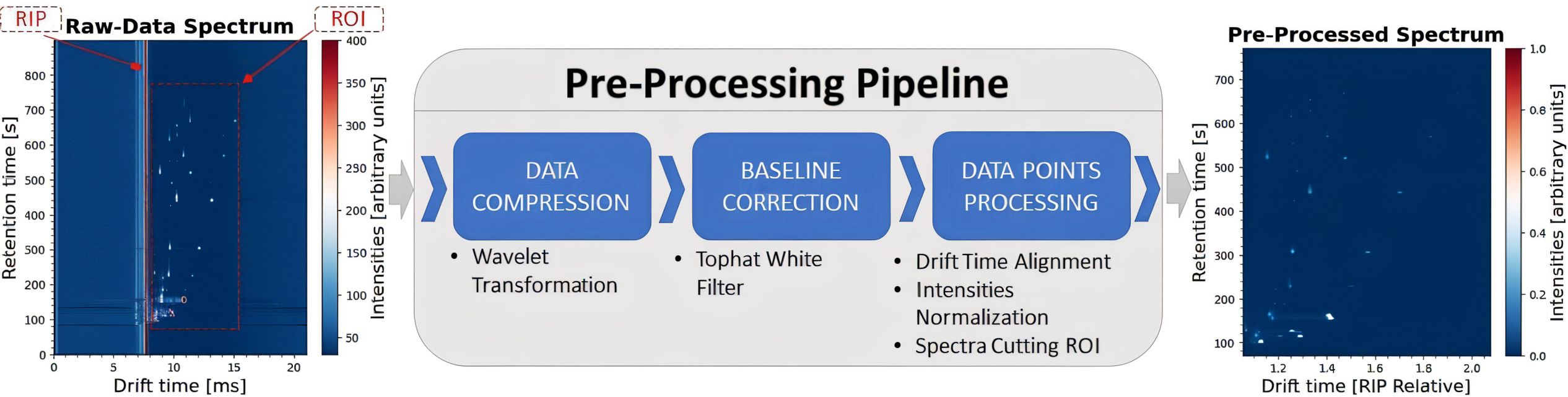 Given the high dimensionality of the input data (3,150 × 6,123), a standard procedure involves applying a pre-processing pipeline (illustrated in Figure 1) to reduce data size, denoise spectra, and extract the most relevant information. To this end, we utilize the open-source Python package gc-ims-tools (Christmann et al., 2022), in accordance to the dataset’s initial publication (Christmann et al., 2024). First, we apply a third-degree wavelet transformation to both the drift and retention time axes, significantly reducing the dimensionality of the spectra to one-tenth of the original data to each direction. Then, a baseline correction algorithm is applied to remove instrumental variations or background noise, using a white top-hat filter of size 15. Finally, to properly prepare the input data for the models, we apply various data points processing techniques. Drift Time Alignment adjusts the drift time axis relative to the Reactant Ion Peak (RIP), which is a standard technique for the task, due to instrumentation variations. Intensities Normalization between zero and one, is a common technique for efficiently training ML and DL models. While, Spectra Cutting is applied on the Region of Interest (ROI), which contains the most valuable information selecting the RIP-relative drift time range between 1.05 and 2.10 and the retention time between 70 and 780 s. The output of the pre-processing pipeline is shown in Figure 1, where the spectral shape is reduced to (152 × 600), resulting in a significant 99.5% reduction in data size.