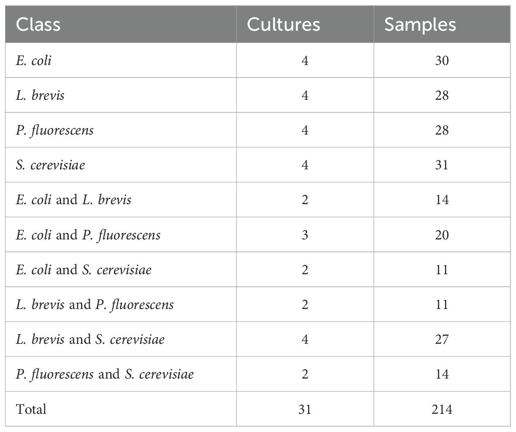 To evaluate the models’ performance and their applicability in identifying microbial organisms, we conducted experiments using a publicly available dataset of GC-IMS data from four different organisms (Weller and Christmann, 2023). These include three bacteria, Escherichia coli, Levilactobacillus brevis, and Pseudomonas fluorescens, and one fungus, Saccharomyces cerevisiae. Pure cultures of these organisms were prepared, along with six different mixtures combining each pair. The dataset consists of 10 different classes, with 31 unique cultures analyzed to generate 214 distinct GC-IMS spectra samples. In Table 1, we present the number of Cultures and Samples for each class of the presented dataset.