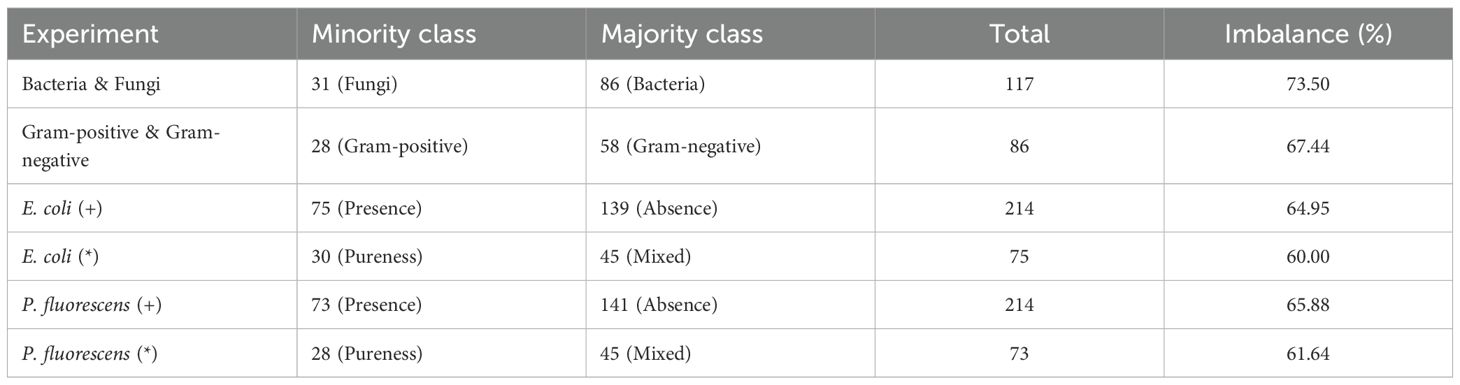 On the other hand, we explore the possibility of specifically identifying either the Presence (+) or the Pureness (*) of two distinct pathogenic bacteria, E. coli and P. fluorescens. As presented in Table 4, to properly evaluate the models’ ability to detect the presence of a specific bacterium, we assign a value of 1 (one) to all the classes containing the given bacteria and 0 (zero) to all the remaining classes. Subsequently, by training from-scratch the models, we investigate their ability to identify the pureness of the bacteria among all the classes in which it is present. This experiment highlights the models’ sensitivity on the given bacteria. These two rounds of experiments are conducted for each bacteria, serving as a baseline for identifying pathogenic bacteria using ML and DL methods based on GC-IMS spectra. Similarly, dataset imbalance is also observed in these experiments (Table 2). For the E. coli (+) experiment, the dataset includes 75 samples with presence and 139 with absence. In the E. coli (*) experiment, results are reported for 30 pure samples and 45 mixed samples. Likewise, for P. fluorescens (+), there are 73 samples with presence and 141 with absence, while the P. fluorescens (*) experiment includes 28 pure samples and 45 mixed samples.
