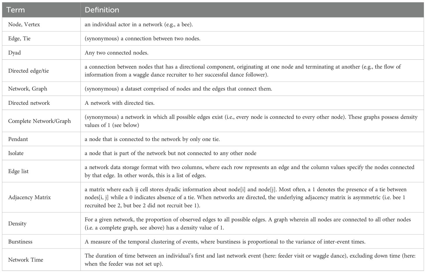 Our results also highlight the importance of calculating and interpreting network metrics in the context of the behavior and biology of the organism under study (Makagon et al., 2012; Alves et al., 2023). The default baseline for calculating network density, a complete graph where every node is connected to every other node (Bang-Jensen and Gutin, 2018), could not occur in the context of honey bee behavior. A forager bee, once committed to a food source, could not then be recruited to it again by every other forager bee. The large difference we found between the default method versus our biologically-informed approach emphasizes that such system-specific customization of network analyses can help glean more relevant insights into biological systems.