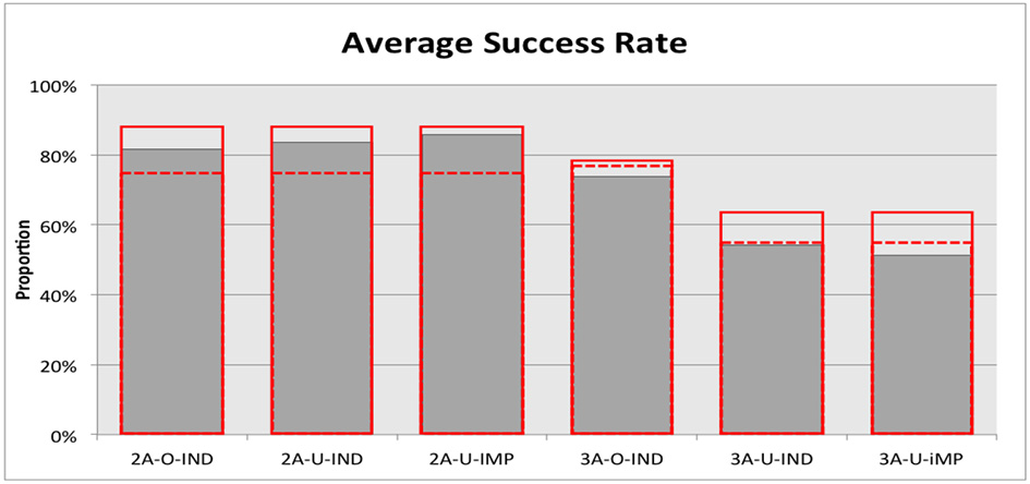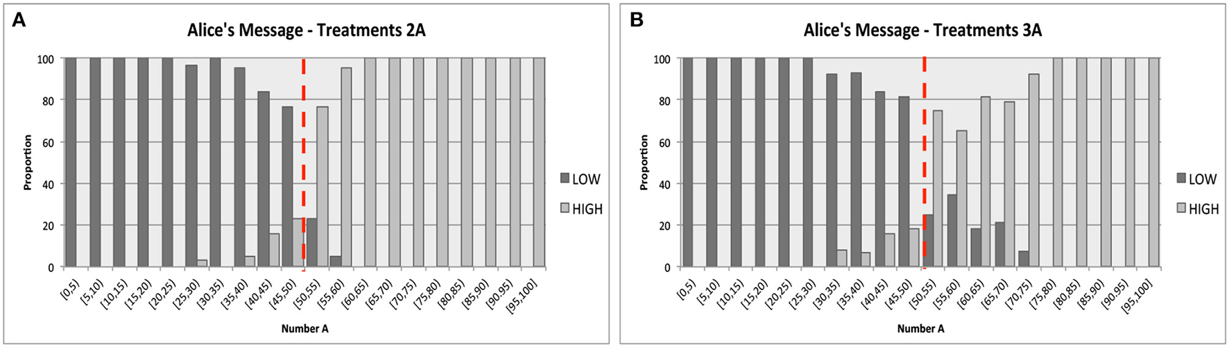 To best test whether the players indeed effectively use the optimal literally vague language, we consider the counterfactual in which they do not, which can be formally modeled as Bob being constrained to use the same messaging strategy regardless of Alice's message. In this case, the best Bob can do is to always use the cutoff of 50, and the corresponding success rate is 75%. To examine the results and test whether the counterfactual holds, we pay particular attention to how Bob's use of language depends on Alice's message.