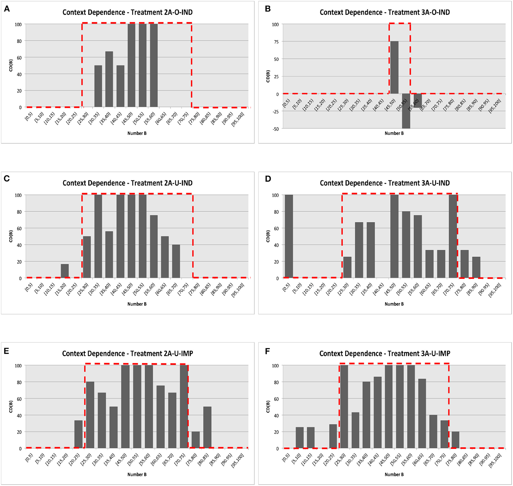 18.^ To conduct Mann-Whitney tests for Hypothesis 4, we first eyeball Figures 3A–F to identify the plausible choices of the interval with CD(B) > 0 for each treatment. For example, for Treatment 2A-O-IND, relying on Figure 3A, we divide the support of number B into three intervals—[0, 30), [30, 60), and [60, 100]. We next calculate the value of CD(B) for each of the three intervals for each matching group. Taking those values as group-level independent data points for each treatment, we conducted the non-parametric test.