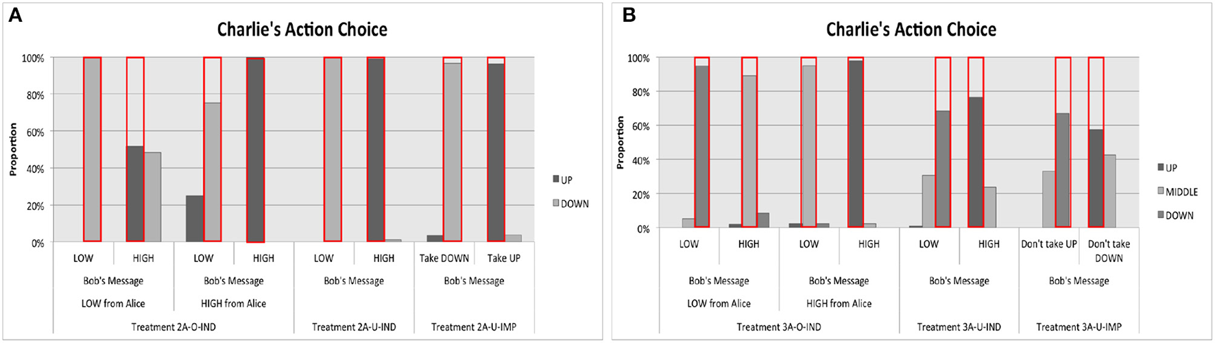 12.^ For example, Bob's message spaces in Treatments 2A-U-IND and 2A-U-IMP are {“B is HIGH,” “B is LOW”} and {“Take UP,” “Take DOWN”}, respectively.