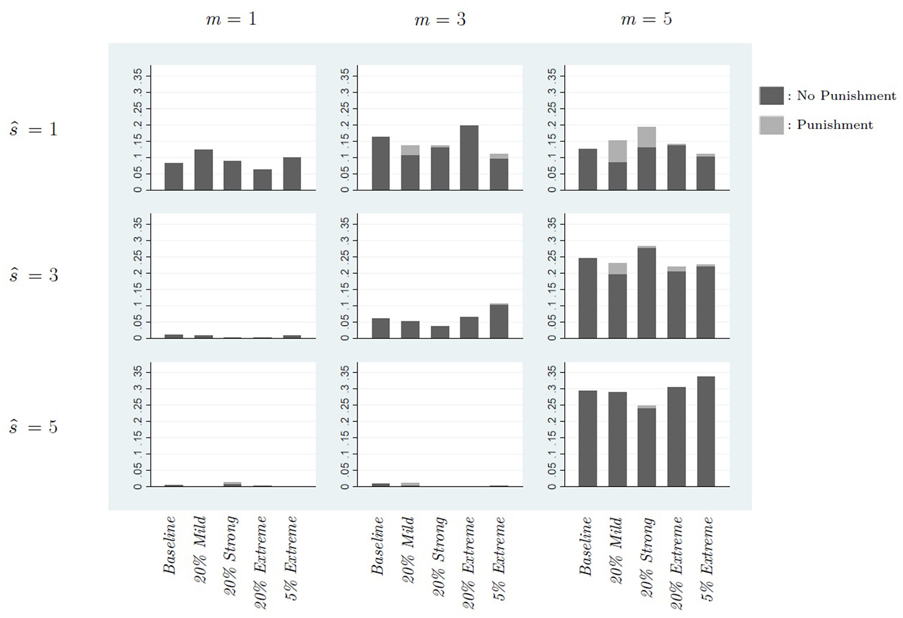 Figure 1 displays the raw data of receiver signals (ŝ), messages, and punishments in the Punishment Game. The receiver signals {1, 3, 5} correspond to the three rows, and the sender messages {1, 3, 5} correspond to the three columns. The (stacked) bar chart within each signal-message cell reports the frequency of that receiver signal and message, with the light gray fraction showing the punishment frequency.