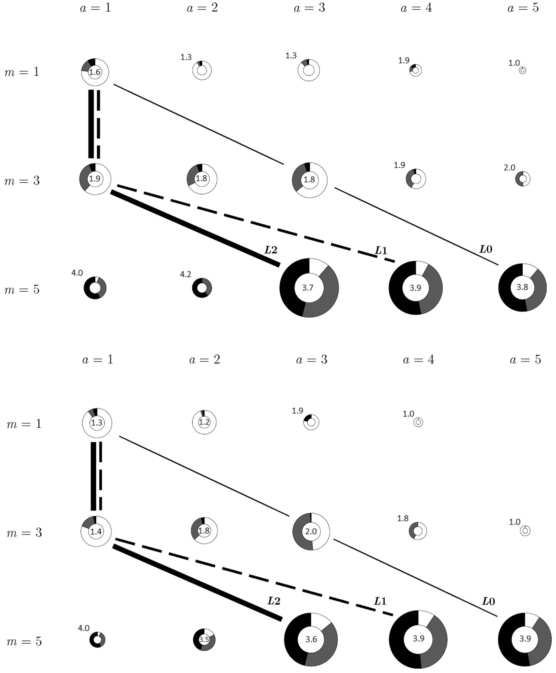 Receiver action and underlying states in baseline (top) and punishment (bottom) game (b = 2): donut size scaled by frequency of action taken. Fractions in each donut represent state occurrence for each message and action. The darker the color, the higher the state. The number inside or near each donut is the average realized state.