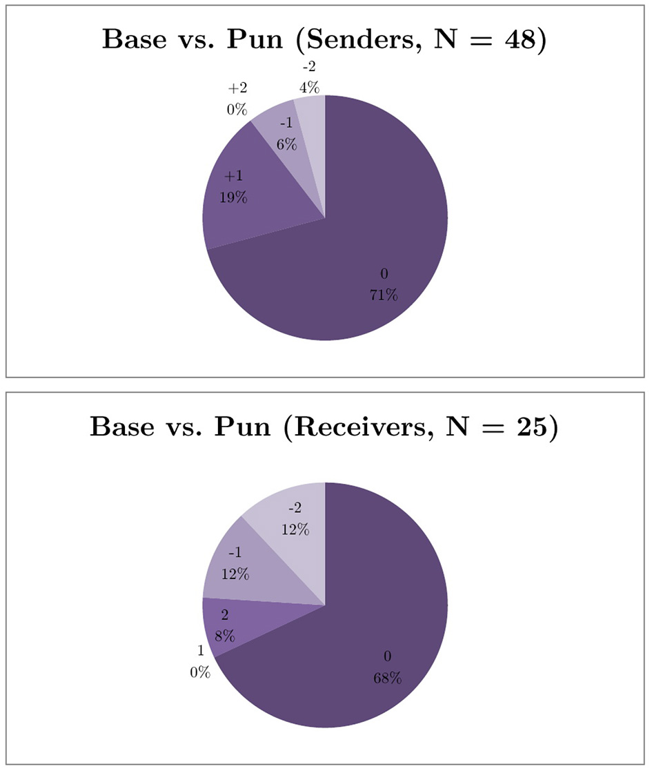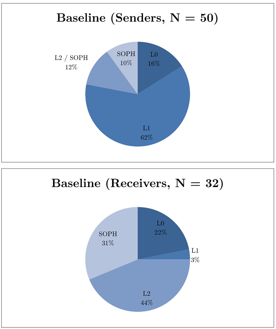 Figure 2 reports the raw data of states, messages, and actions for bias b = 2 in the Baseline and Punishment Game. As the main behavioral changes are observed in receivers, the figures are displayed from a receiver's viewpoint. Supplementary Figure 1 report the raw data in the Punishment Games of the four treatments separately, while Supplementary Figures 2–4 report from a sender's viewpoint. The messages {1, 3, 5} and the receiver actions {1, 2, 3, 4, 5} correspond to the three rows and the five columns, respectively. The size of the donut chart within each message-action cell is scaled by the occurrence of corresponding message and action. Hence, the rows indicate receivers' decisions with respect to different messages. The fractions in each donut chart show the distribution of states conditional on that message-action pair, and the number inside the donut shows the average state. White, gray, and black fractions correspond to the frequency of state 1, 3, and 5, respectively. Finally, the actions predicted by level-k types are connected by various lines. In fact, compared to the Baseline Game, receivers choose action a = 4 and 5 more often but take less a = 3 when received message m = 5 (receivers trust sender messages more when punishment is available). When punishment is available, the conditional mode of receiver actions when message m = 5 increases from 3 to 4, getting closer to the average states (overall information transmission increases).