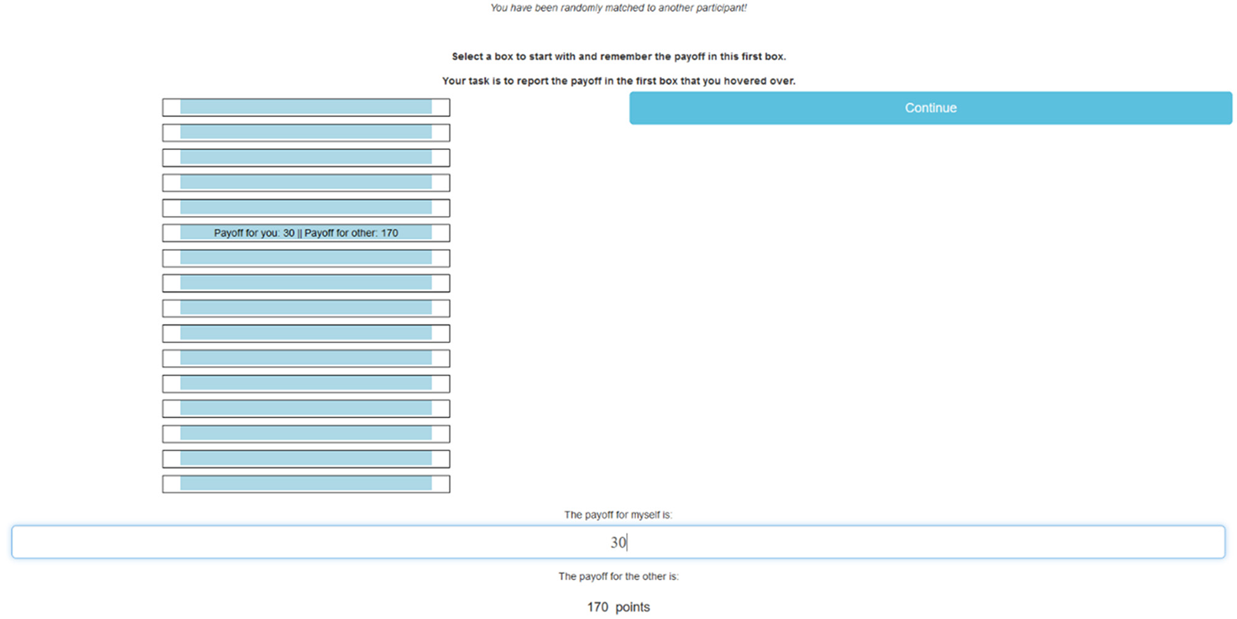 Figure 1 shows an example screen of the lying task. The screen contained 16 boxes, all of which were closed. The boxes contained combinations of payoffs that would become visible when subjects hovered over them. These payoff combinations for oneself and the other participant would always add up to 200 so that a higher payoff for oneself would reduce the other participant's payoff. We displayed a fixed set of 16 payoff combinations in four different orders, one of which was randomly selected for each subject. The payoff combinations ranged from 2 for oneself and 198 for the other to the reverse. The full set of available payoff combinations can be found in the Supplementary Section 1. Subjects were explicitly asked to select a box, hover over that box, and remember the payoff to themselves from that first box. This would be the outcome they were asked to report. They were also instructed to hover over as many boxes as they wanted. The only constraint (which subjects were also informed of) was that the computer would check whether the reported payoff was present in any of the boxes.