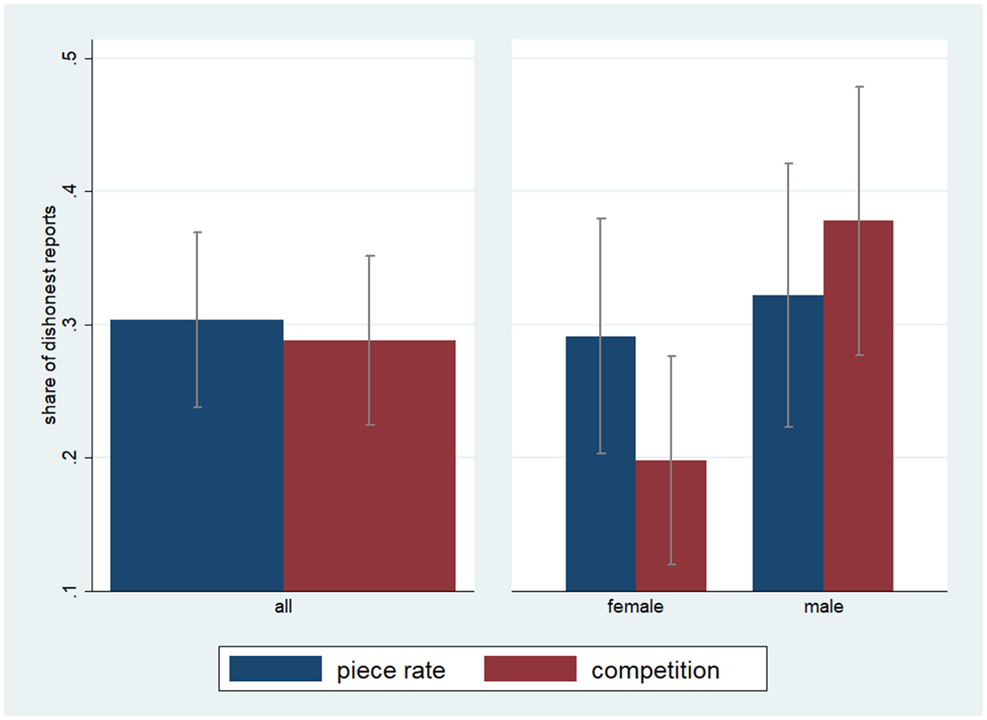 An interesting pattern emerges when we look at the difference between genders within a treatment. In treatment piece rate, men and women are similarly likely to lie, with values of 32% for men and 29% for women. Instead, in treatment competition, men are much more likely to lie at 38%, while only 20% of women do. This difference is statistically significant (p = 0.005).