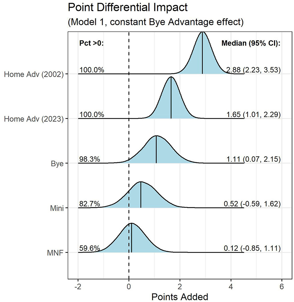 Arguably, the perception of a rest differential impact in the NFL outweighs the evidence. Both Sung and Tainsky (2014) and Sung (2020) found that the bye week provided a competitive advantage that had not yet been picked up in betting markets. However, in neither paper was there a comparison pre and post CBA. Post 2011, Murray (2018) identified that home teams with a one-day MNF disadvantage lost more often than expected, while finding no benefit to a bye advantage. Finally, Karwan (2021) tied the 2011 CBA change to a decrease in the impact of rest for the home team. However, relative rest was not explicitly modeled. Additionally, Karwan (2021) used the betting market point spread as an explanatory variable in models of point differential, which would conceal the effect of rest differential if betting markets already accounted for it.