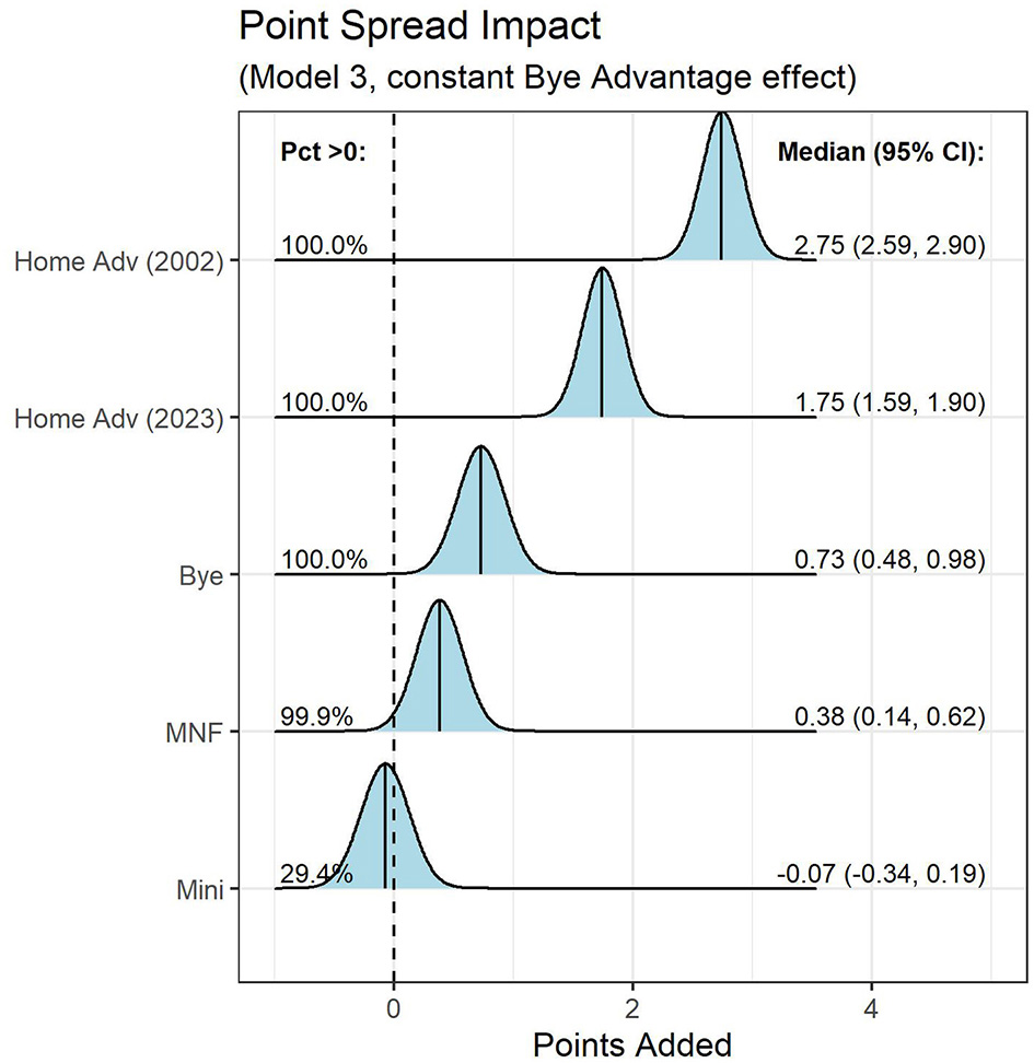 In Model 3, αMNF, αMini, and αBye reflect the relative change in point spread given to teams with each of the three rest advantages. Akin to Model's 1 and 2, θs, i and θs, j reflect season-level team strength (relative impact in point spread) for home team i and away team j. Additionally, μHA, s reflects the season-level home advantage given to the home team in betting markets.
