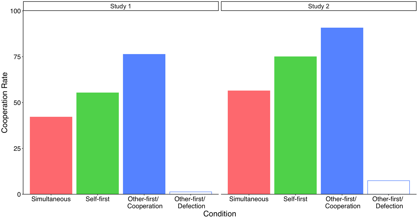 Conditional differences in cooperation rates in simultaneous, self-first, and other-first conditions in Study 1 (left panel) and Study 2 (right panel).